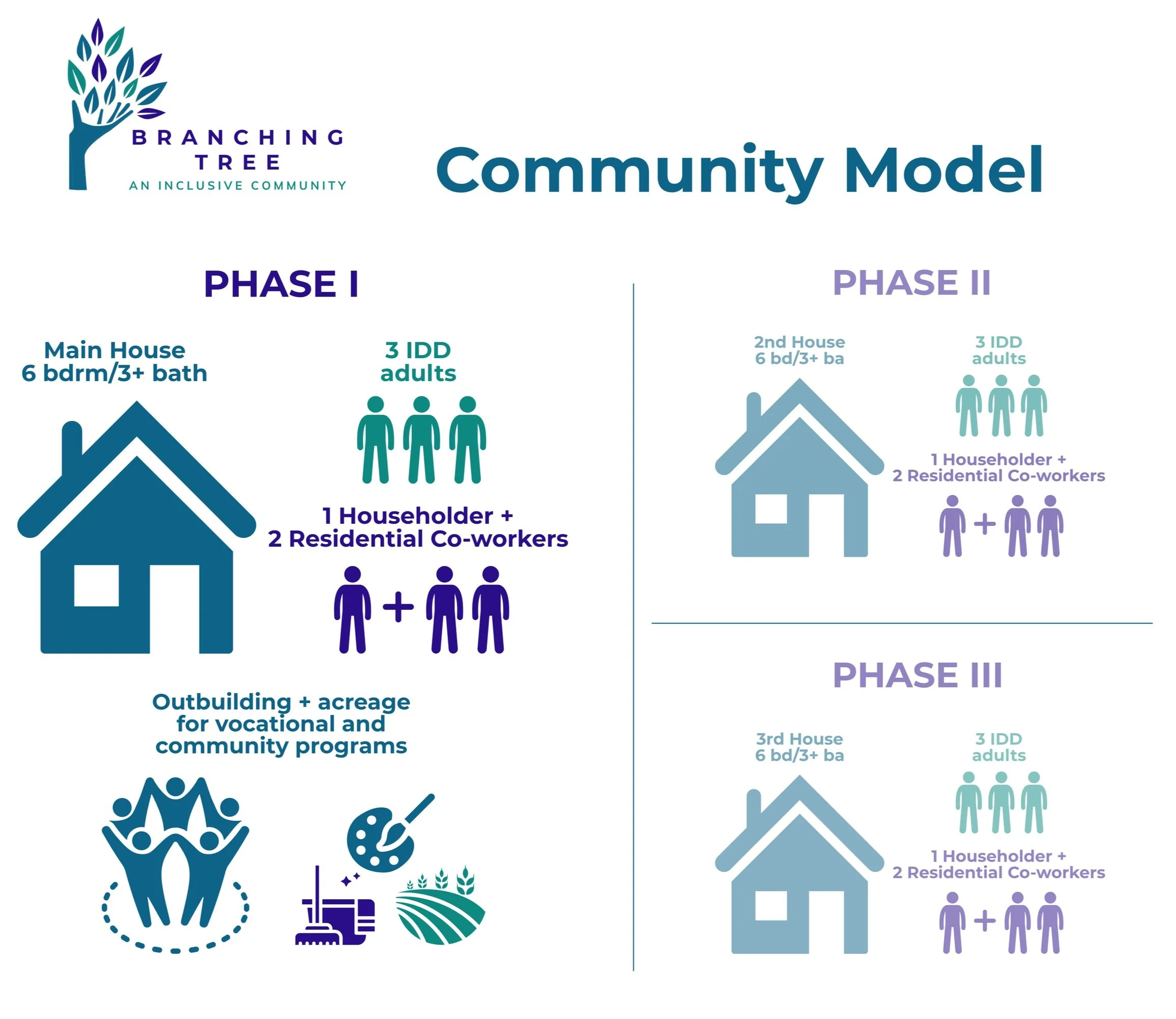 At Branching Tree, we’re developing a small, fully inclusive residential community. The property will be situated on several acres of land with room to expand, plus shared indoor and outdoor spaces and access to nature. The community will start with approximately 6-7 individuals: